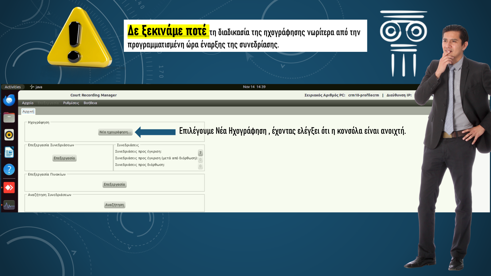 - Χρήση ακουστικών: Τα ακουστικά πρέπει να είναι πάντα συνδεδεμένα στη μονάδα του υπολογιστή και να χρησιμοποιούνται καθ’ όλη τη διάρκεια της ηχογράφησης.