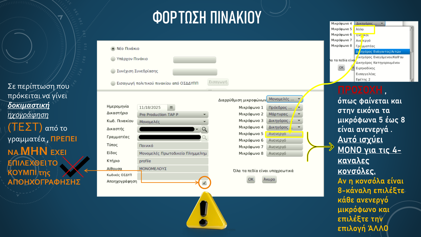 - Επιλογή σωστού Profile: Κατά τη δημιουργία πινακίου, ο Γραμματέας επιλέγει το κατάλληλο profile. Ανάλογα με το profile, ενεργοποιούνται συγκεκριμένα μικρόφωνα.
